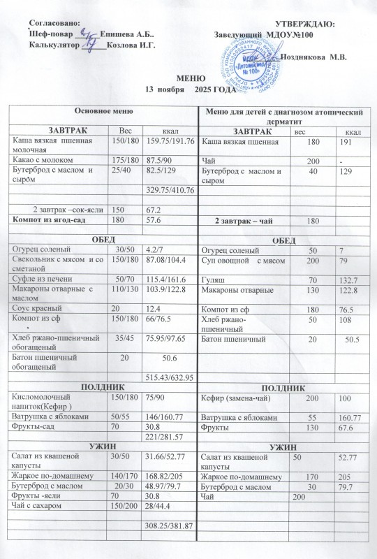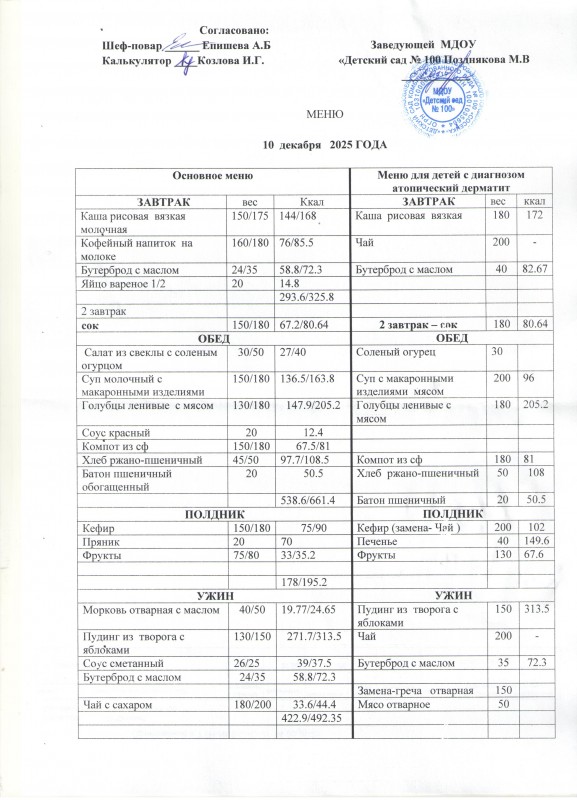На основе цикличного десятидневного меню составляется ежедневное меню и утверждается заведующим детского сада.