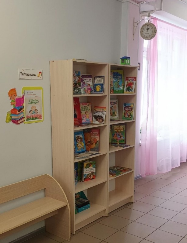 В холле детского сада расположена библиотека для домашнего чтения, которая оформляется и пополняется по актуальным темам жизни детского сада и семьи. |