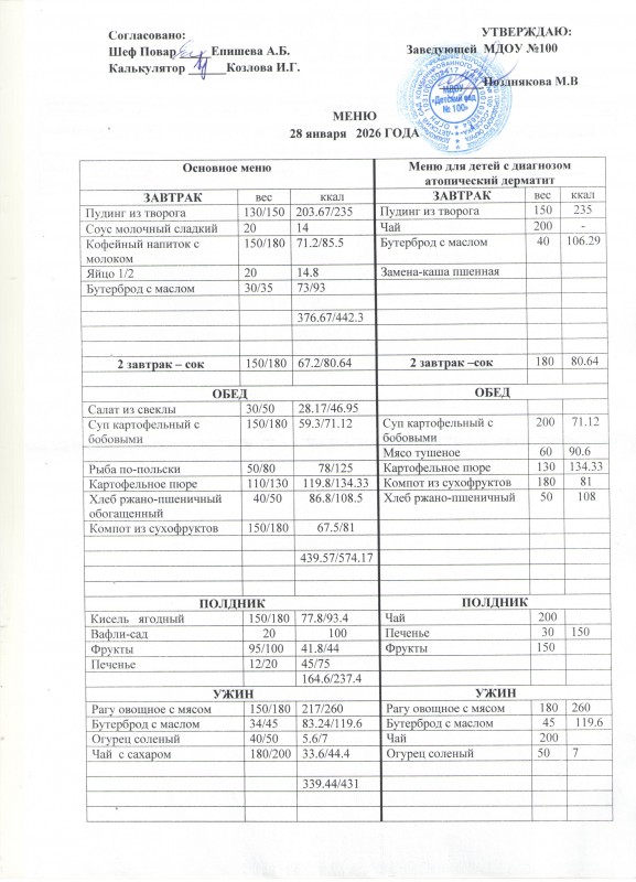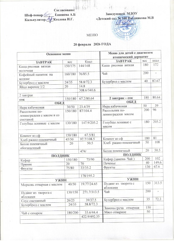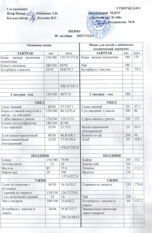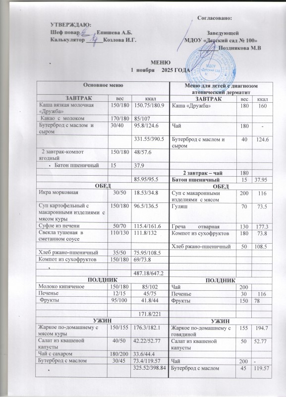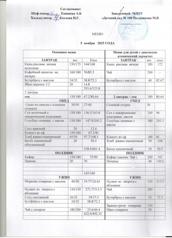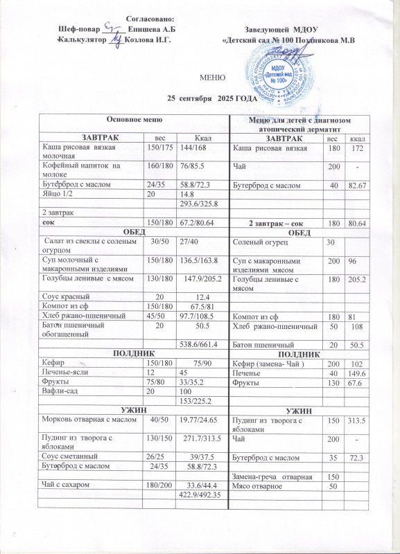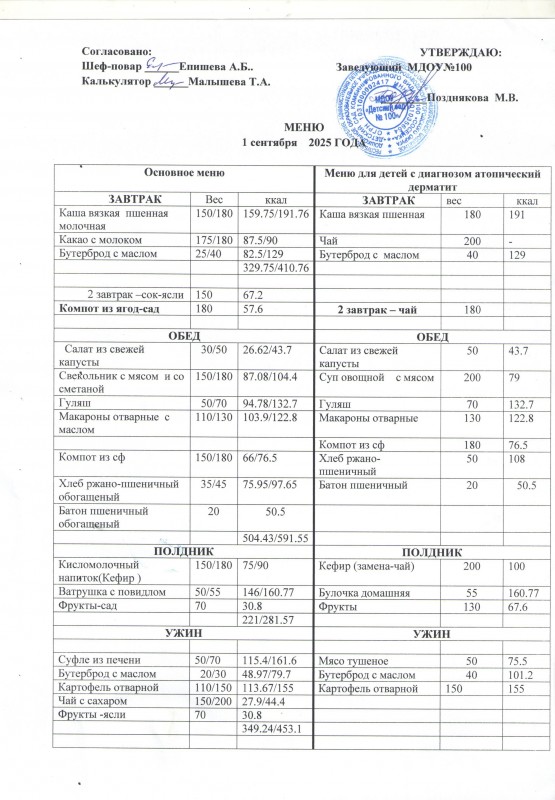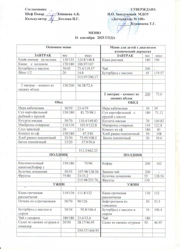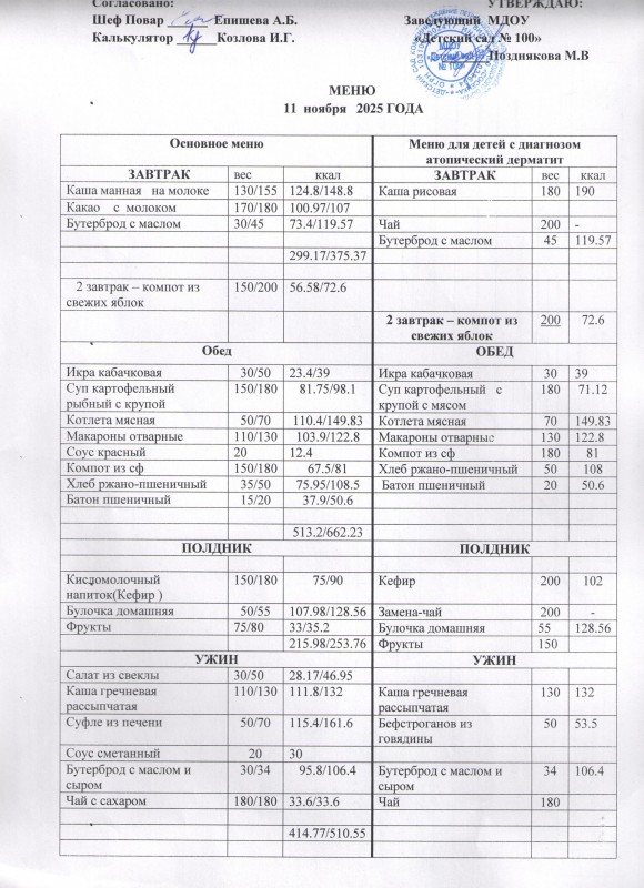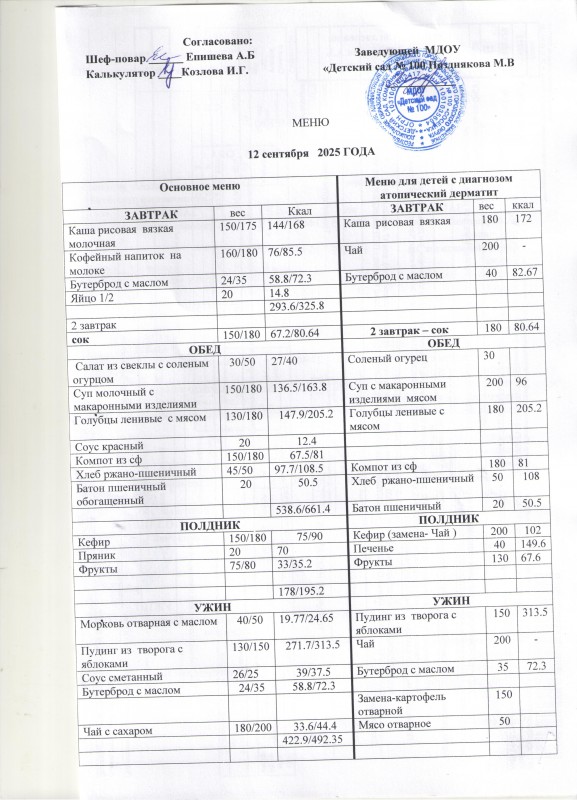 На основе цикличного десятидневного меню составляется ежедневное меню и утверждается заведующим детского сада.